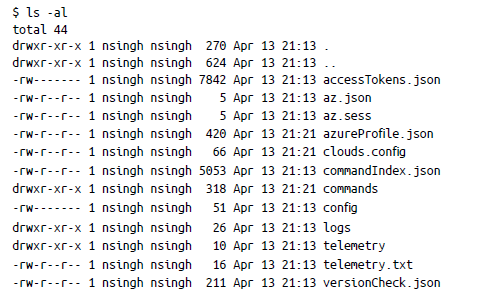 Ahora que has iniciado sesión correctamente y te has autenticado con Azure, puedes comprobar el directorio ~/.azure, que contiene la información de autenticación y autorización: