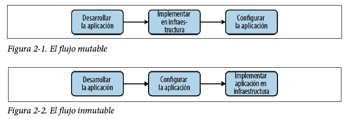 El cambio de la arquitectura monolítica a los microservicios también ayudó a la IaC a ganar impulso al garantizar que las aplicaciones modernas fueran capaces de seguir la metodología de «aplicaciones de nueve factores», lo que permite tomar decisiones de infraestructura con independencia del desarrollo de aplicaciones. Otra ventaja importante de la IaC en a creación de infraestructura nativa en el cloud es que permite una infraestructura inmutable; es decir, una vez que la infraestructura se implementa, no se puede cambiar ni configurar. En un escenario típico de implementación de aplicaciones mutables, se desarrolla una aplicación, después se implementa en la infraestructura subyacente y, finalmente, se configura en la infraestructura subyacente (figura 2-1). Este proceso introduce una desviación de la configuración, cuyo resultado es una infraestructura que es diferente de su estado inicial. La infraestructura inmutable, sin embargo, consiste en la reimplementación de la infraestructura y las aplicaciones cada vez que se inserta un nuevo cambio, lo que mantiene la infraestructura en su estado exacto. La inmutabilidad se logra desarrollando y configurando la aplicación en un estado preconfigurado (por ejemplo, una imagen de máquina) e implementándola después (figura 2-2).